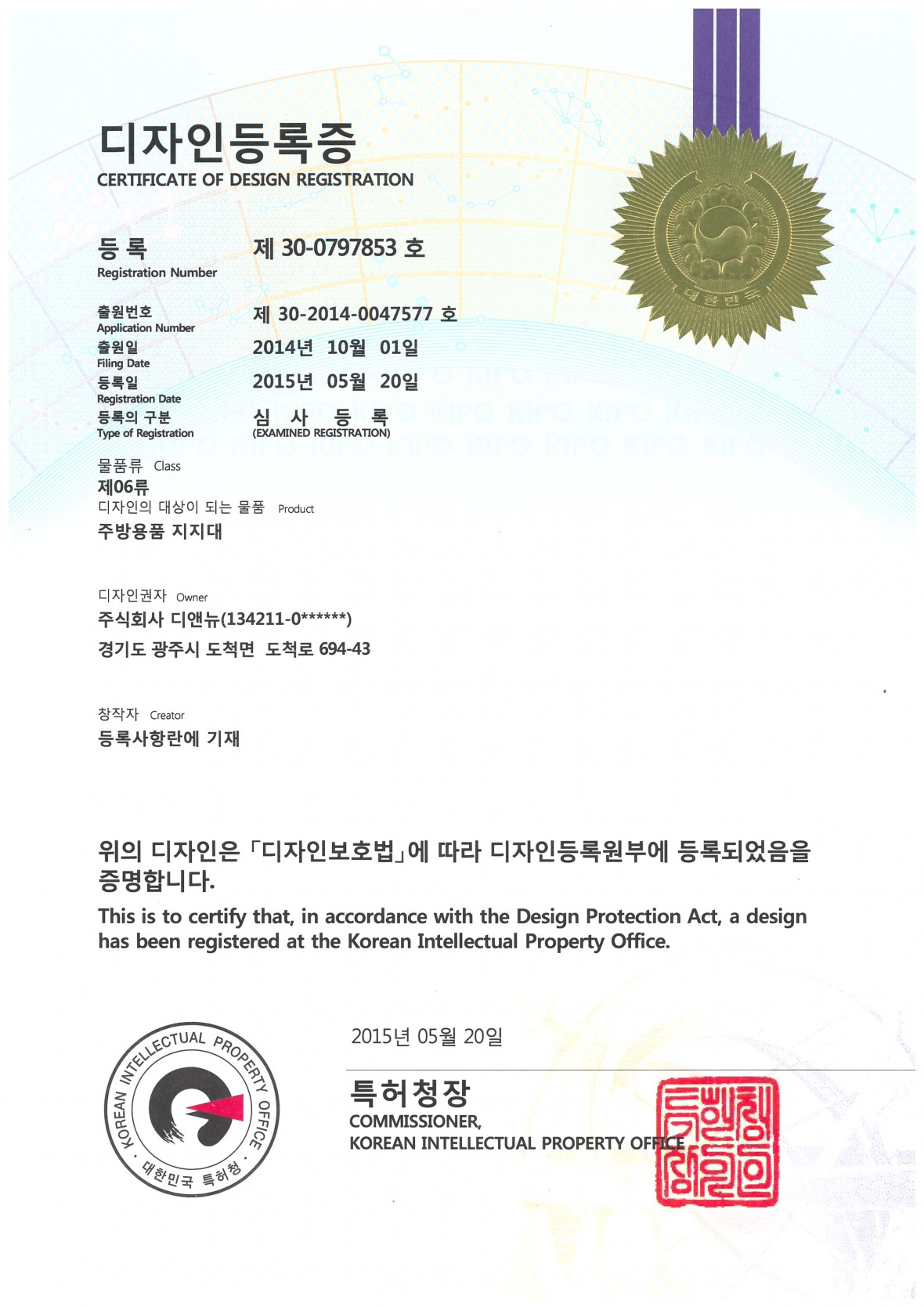 디자인등록증_주방용품 지지대