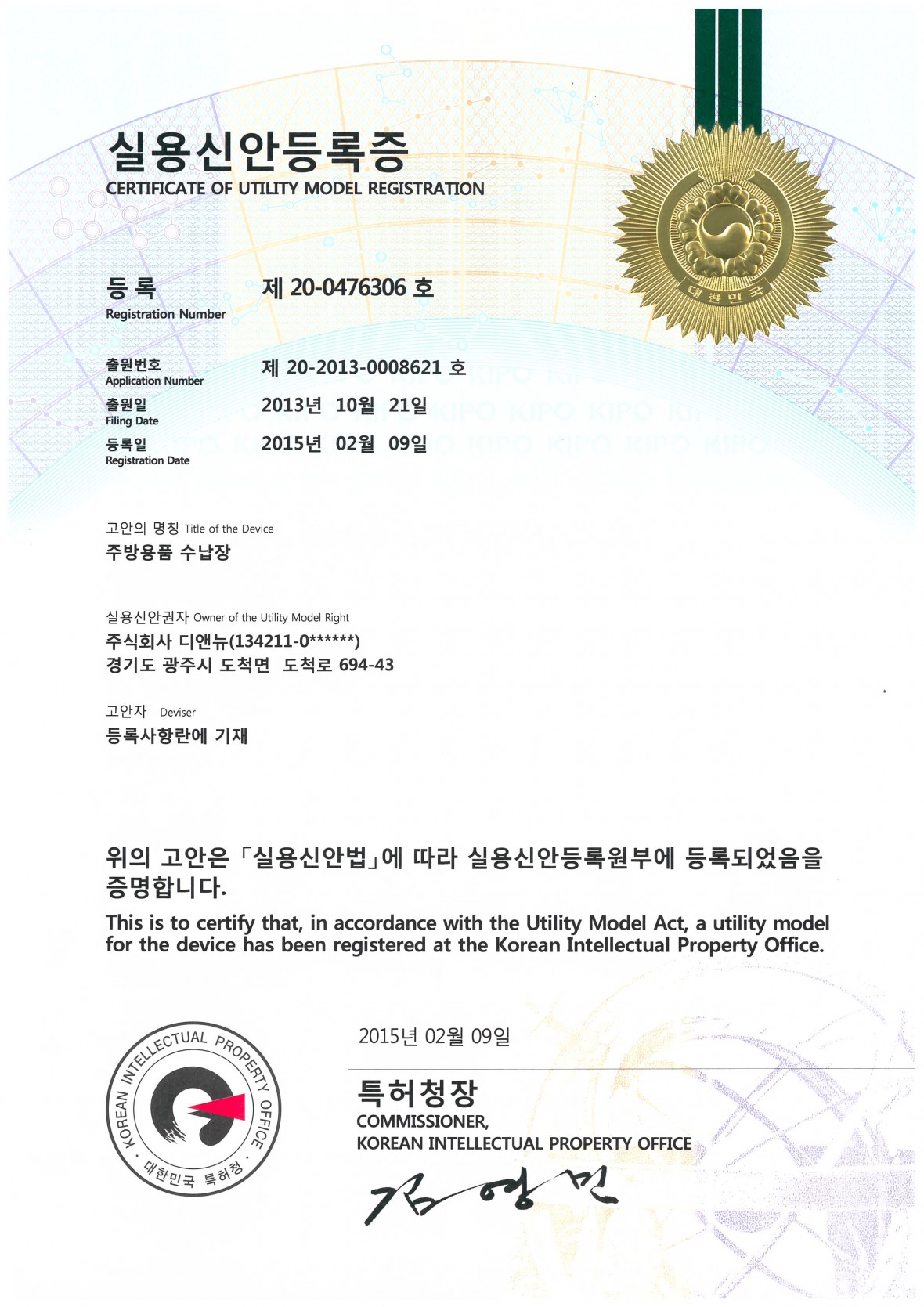 실용신안등록증_주방용품 수납장 > 특허내역/sub0104/Patent
