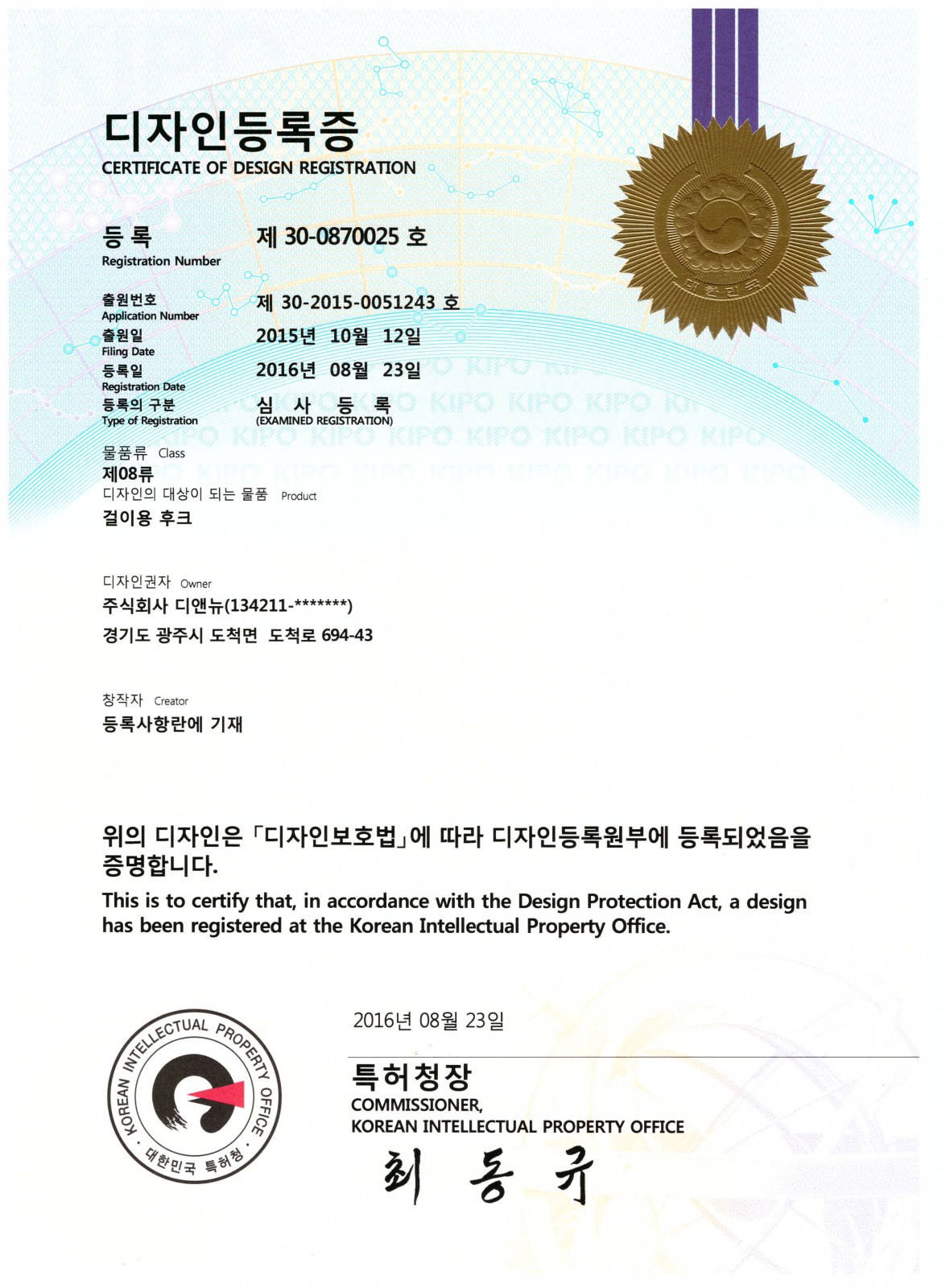 디자인등록증_걸이용 후크 > 특허내역/sub0104/Patent