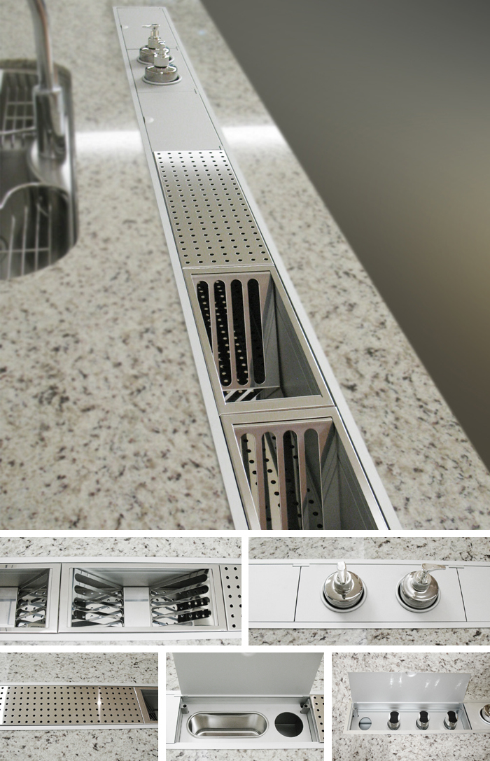 다양한 아이템들을 주방 뒷선반 부위에 매입시켜 사용하는 제품으로 상판의 너비와 폭에 따라 건조대, 양념통, 디스펜서, 콘센트, 다용도함, 접시꽂이등을 조합하여 편리하게 사용할 수 있습니다. 댐핑기능 추가시 덮개를 닫을때 소음이 나지 않습니다.