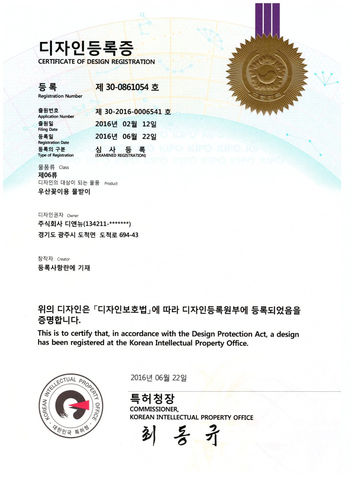디자인등록증_우산꽂이용 물받이 > 특허내역/sub0104/Patent