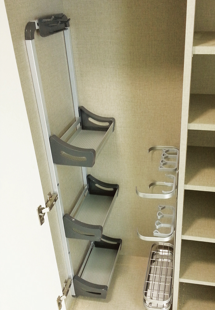 신발장(현관장)에 각종 소품보관이 용이하며 제품에 따라 바스켓 높이를 조절하여 사용할 수 있고 상부에 사출물 고리가 설치되어 있어 짧은우산, 비상후레쉬, 각종 용품을 걸 수 있습니다.
