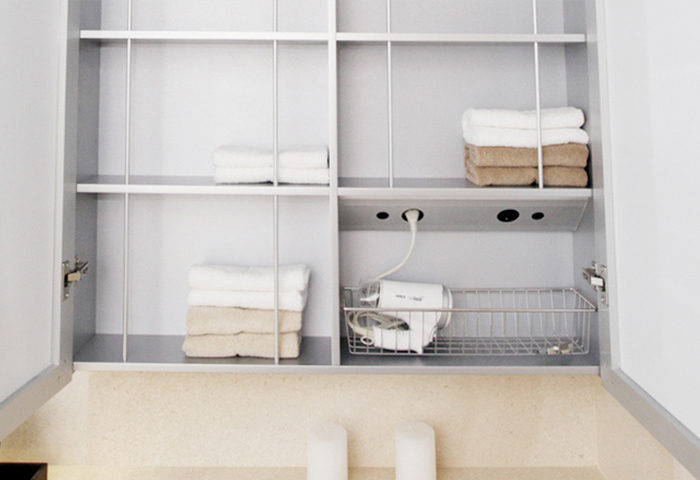 욕실 거울 수납장 안에 간편하게 소품을 수납할 수 있는 와이어 바스켓입니다. 제작이 간편해 비규격 제작이 용이하고 Stainless 재질으로 녹이 슬지 않습니다.
