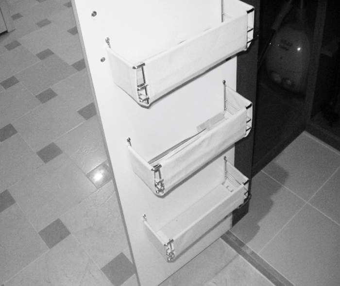 싱크대 도어배면에 적용되며 다양한 주방용품을 보관할 수 있습니다. 패브릭타입과 와이어타입이 있습니다. 규격에 따라 400, 500, 600용이 있습니다.