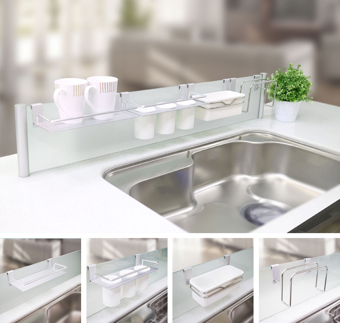 대면형 주방에서 싱크볼 밖으로 물튀김을 방지해주는 파티션 입니다. 또한 대면형 주방 특성상 뒷선반이 없어 수납이 곤란한 부분을 파티션 엣지에 브라켓을 이용하여 수저통, 컵선반, 도마꽂이, 바스켓 등을 설치하여 편리성을 도모하였습니다.