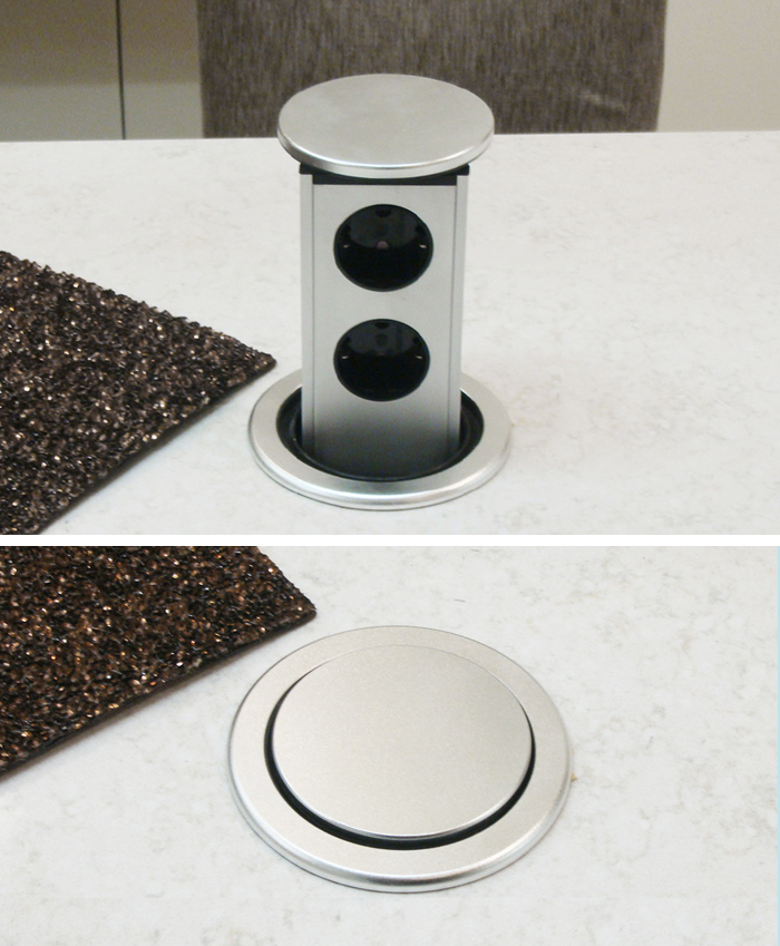 상판을 타공하여 매입이 되며 덮개를 누르면 자동으로 인출 됩니다. 덮개가 닫힌 상태에서 생활방수가 되도록 설계 되었고 가구 마감에 따라 실버와 흙니켈 커버를 선택할 수 있으며 커버 탈착이 가능해 차후 AS대응이 편리합니다. 커버 콘센트 설치가 힘든 아일랜드장 등에 적용하여 가전기기 사용의 편리함을 높여주며 상부 커버가 알루미늄으로 되어있어 고급스러운 디자인을 강조하였습니다.