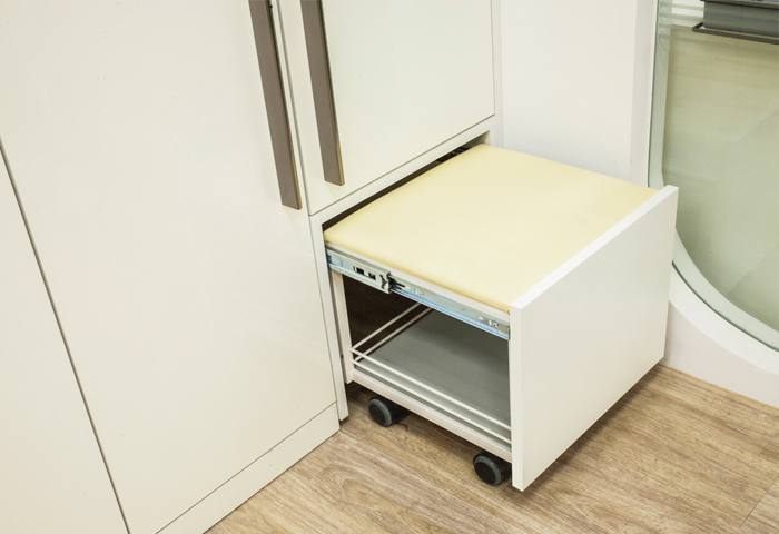 신발장 하단에 빌트인으로 매입됩니다. 신발을 신거나 구두를 닦을 때 인출하여 의자로 사용할 수 있습니다. 의자 하부에 바스켓을 두어 소품수납이 가능합니다.